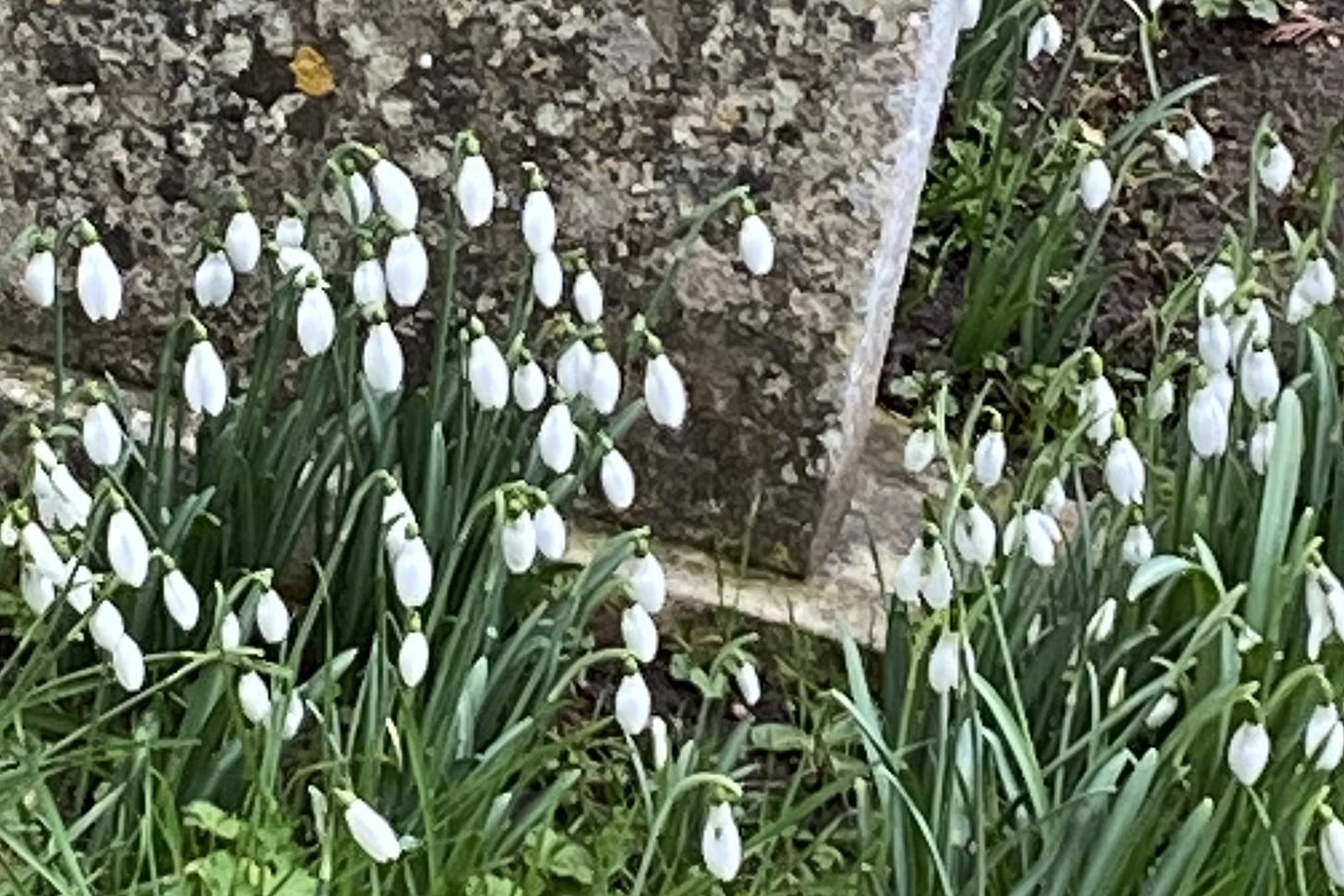 Sad to say, rather like last month, February has been wet, cold and grey. There were, according to my journal two sunny-ish days. These were notable because of the way everyone I met noted how their mood lifted, they felt brighter and it brought home how our bodymind needs sunlight and clear skies. When the weight of meteorological gloom lifts, it reminds us that, it is not going to be grey forever. The appearance of spring bulbs confirms this too: snowdrops, daffodils, narcissi, and the first grape hyacinths.