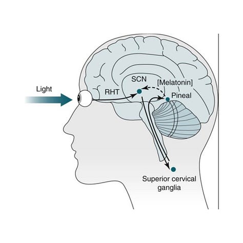 Our exposure to diminishing daylight is the principal signal for the brain to begin organising its own daily reset, and the mechanism that does that is tiny, only about 1mm3 so about the size of a sesame seed. It’s called the suprachiasmatic nucleus and it sits at the crossover point of the optical nerves - take a look at the images below to map this information for yourself. At the onset of darkness, it instructs the pineal gland (another very small structure of about 5mm, so indeed about the size of a pine nut) to secrete a messenger hormone called melatonin and the message it circulates for the body systems is that it’s "time for bed”.